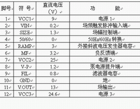 根据故障现象,分析此故障一般发生在场扫描有关电路。先查M301○1、○7、○12脚供电电压,均正常;再查M301输出级及输出级到负反馈端之间的元件。先拆下输出电容C306检查其充放电过程,基本正常,但为了更快排除故障,还是将其换新。再查○11与○6脚之间R306、R314、C304等元件,以上元件的作用是起交、直流并联电压负反馈,以获得良好的场扫描线性,将C304更新,其它元件检测正常,开机,故障依旧。排除外围元件损坏的可能后,怀疑故障出在M301集成电路(各脚功能及正常电压值见下表)。测其○11脚VouT电压为8V左右,远比正常值13V低,分析M301内输出级电路有损坏。将TA8445K换新试机,故障排除。