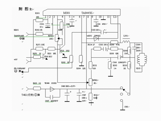 根据以上原理,先检测M301○11脚(场偏转输出)有约12V电压,说明M301输出级电路基本正常,检查偏转线圈也正常,估计故障发生部位为前级场扫描部分。测其Vcc1、Vcc2供电电压分别为9V、25V, 正常;再测○2、○3、○4、○5脚电压分别为0.2V、1.3V、0V、3V,均正常;而测其○6脚电压异常。拆下R304检测,正常;拆下R303检测,已开路损坏。换一新1Ω/1W电阻,彩电恢复正常。