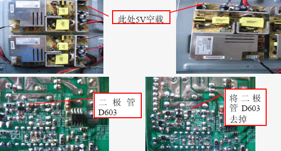解决方案:将电源板(两块)背面二极管D603去掉。