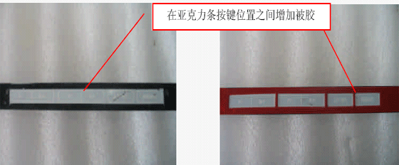 故障原因:触摸按键前压克力条由于粘合不牢翘起,使装饰条内的金属层与触