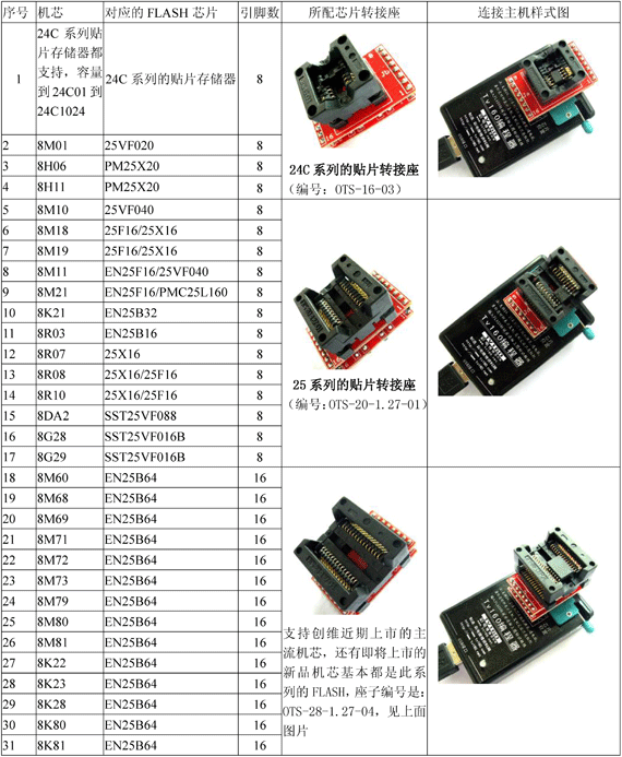 下表中机芯是创维目前市场上占有量80%的液晶彩电机芯,如最新的K10系列、03系列、05系列,本编程器全部支持,另海信、王牌、长虹、康佳等主流品牌的平板FLASH大部分可烧写,只要是8脚与16脚的FLASH即可。