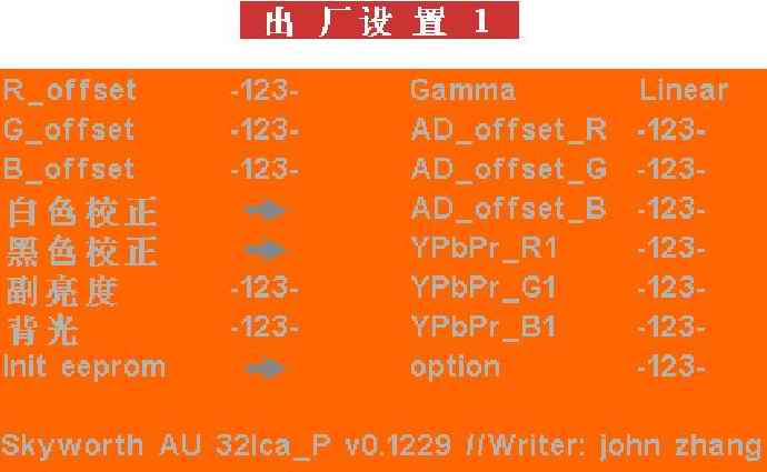 R_offset 123 表示红色偏移设置。只要用频道加减键调到这个位置上。就可以用音量加减键改变里面的数值,就可以把颜色调到我们所希望看到的颜色。