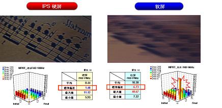 为了检测硬屏的动态清晰度,在权威测试的“动态影像响应时间”灰阶的对比中可以看到,在60Hz画面时,硬屏液晶的动态响应速度均比软屏液晶快,硬屏液晶电视在各个灰阶里都表现出均衡的“动态响应时间”。在达到极速的 120Hz时,硬屏的动态响应速度仍比软屏快,也就是说,在播放急速画面时,硬屏仍能够很好的表现动态画面效果。