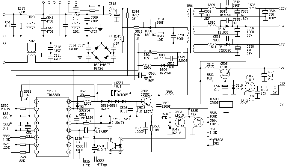 TDA8380的电源供电脚是(5)脚,(10)脚外接C530及内部电路组成锯齿波振荡器。(6)脚外接R522所设定的基准电流为C530提供固定的充放电电流,所以TDA8380的振荡频率由R522和C530的时间常数决定,本机为34KHZ。由TDA8380的(1)脚和(15)脚输出的正、反向激励电流均送到开关管Q502的B极,使Q502工作在开关状态。采用反向激励的目的是使Q502能迅速截止。正向激励使Q502饱和的同时向C525充电,在Q502截止时,C525上所充的电压成为反向激励管的电源。D511—D514这四个二极管使Q502截止时保持2.8V的反向偏压。