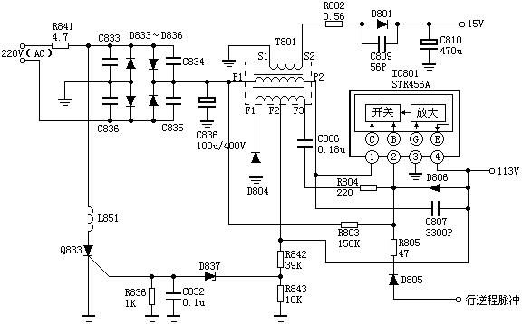 开关关截止后,T801 S1、S2绕组的电压使D801导通,在C810上建立16V电压;F1、F3绕组使D804也导通,T801中储存的磁场能量经D804释放给113V负载,同时C806经R804、D806、T801的F2、F3绕组放电,300V电压经R803给C806反向充电,使IC801的(2)脚电压回升,行逆程脉冲也经D805、R805送到IC801的(2)脚,使IC801提前导通,开始又一个振荡循环。