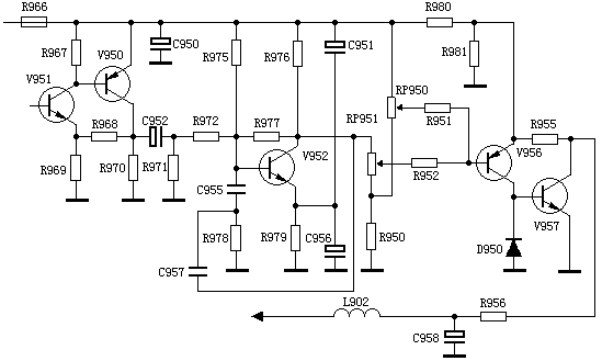 该电路摘自金星D2918机型枕校电路,和枕校电路-1相比,仅多了V951、V950两级放大,其原因是场锯齿波不是取自场偏转线圈取样电阻,而是从TDA8838的(46)脚取得,因幅度较小,所以加了两级放大。