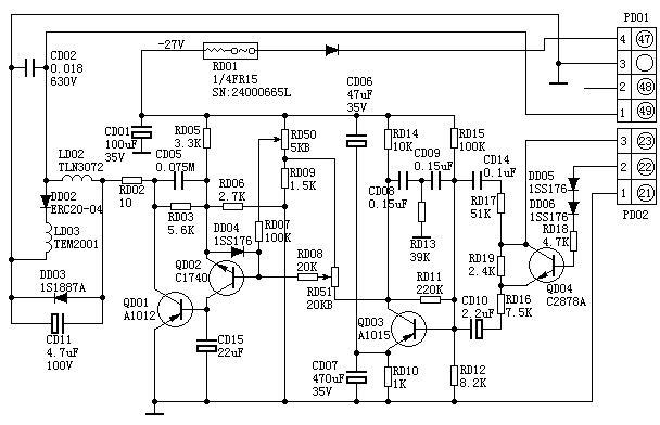 场锯齿波电压经PD02的(3)脚、RD17、CD14、RD16、RD19、CD10送到QD03的B极。QD04为50Hz/60Hz切换电子开关,在50Hz时,QD04截止,而在60Hz时,QD04导通,RD19被短路,送到QD03B极的锯齿波幅度增大。