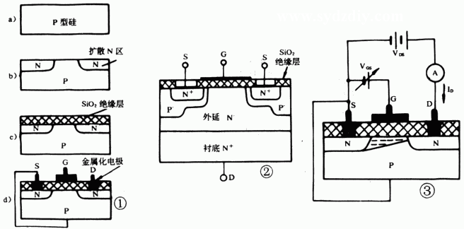 图1是典型平面N沟道增强型MOSFET的剖面图。它用一块P型硅半导体材料作衬底(图la),在其面上扩散了两个N型区(图lb),再在上面覆盖一层二氧化硅(SiQ2)绝缘层(图lc),最后在N区上方用腐蚀的方法做成两个孔,用金属化的方法分别在绝缘层上及两个孔内做成三个电极:G(栅极)、S(源极)及D(漏极),如图1d所示。