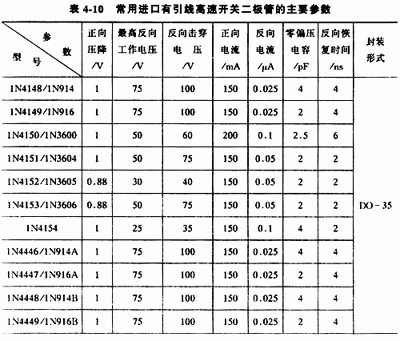 进口高速开关二极管有1N系列、1S系列、1SS系列(有引线塑封)和RLS系列(表面安装),见表4-10和表4-11。