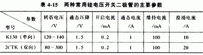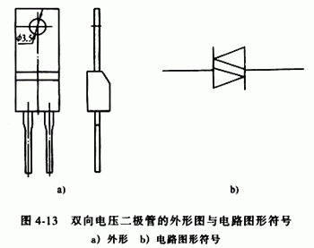 双向电压二极管由NPNPN五层结构的硅半导体材料组成,其正向和反向均具有相同的负阻开关特性。图4-13是双向电压开关二极管的外形图和电路图形符号。表4-15是两种常用硅电压开关二极管的主要参数。