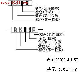 1)在电阻体的一端标以彩色环,电阻的色标是由左向右排列的,图1的电阻为27000Ω±0.5%。