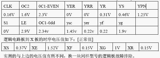 分析与检修:首先区分主板和屏。屏是三星V4 屏,让屏自检后故障还是不开机,判为屏组件问题,按照屏供电时序流程,测屏主电源板供给逻辑板的5V 正常,按开机键逻辑板有开机信号产生,且有来自主电源的3.3V,但电压又回到待机状态保护了,断开Y板,X 板的供电和逻辑板输出的X,Y时序信号,开机后故障依然。再看逻辑板的正常工作是:刚开机指示灯LED2002 亮LED2001 会不停的闪动,开机后LED2002 熄灭。现在是LED2001 没有闪动,开机瞬间测逻辑板上的4 支三端稳压器,发现当有3.3V 时,U2010 和U2008 没电压输出,测F2000 保险电阻开路没有3.3V供电,所引起逻辑电路板没正常工作造成的。换上后开机正常。但是图象没有层次感灰暗,测逻辑电路板到Y板的时序电压值如下:[正常值]