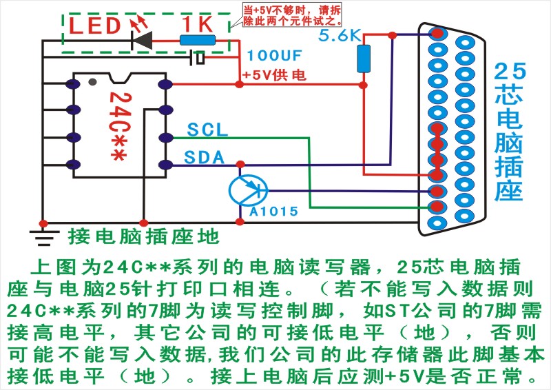 下图为电脑读写器制作电路原理图,按下图制作后,在电脑装上读写软件即可对 24C系列存储器进行读写,详细操作说明见存储器读写软件操作说明.(注意按下图制作后接上电脑,请检查其+5V供电是否正常,否则将会出现错误的读写,因前期有指示灯的此电脑读写器在接上不同的电脑后出现有的+5V供电正常,而有的电脑则5V不足,可能是不同电脑的打印口接负载能力不一样所致,解决办法可拆除此读写器上的发光二极管可使+5V恢复正常: