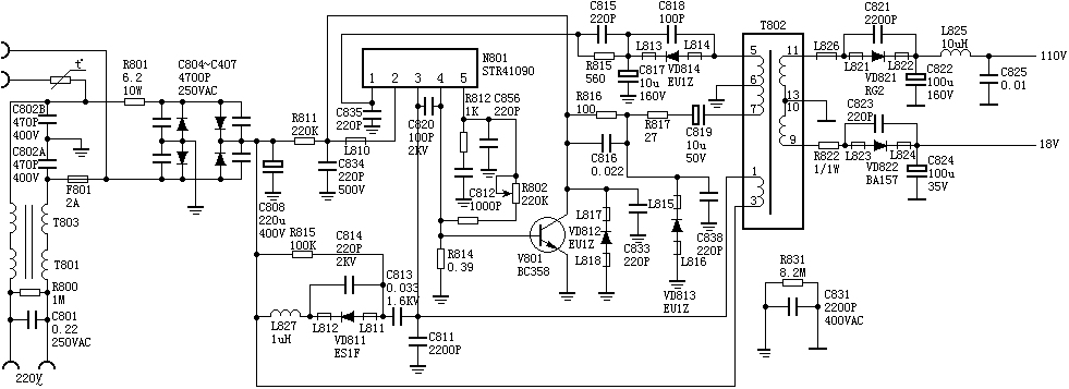 STR41090电源属于自激式并联型开关电源,适应电网电压能力为150-280V。