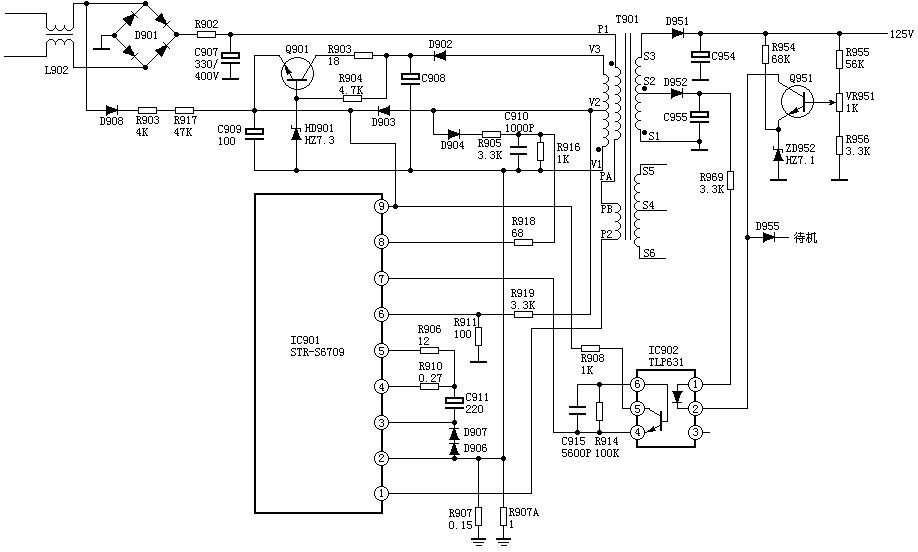 日立A3P-B2为龙影系列彩电,电源采用STR6709厚膜电路,主电源电压为130V,该电源适应电网能力强,保护功能完善,在待机时无需另设遥控电路专用变压器等特点。