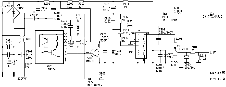 Q901截止后,T901(1)、(3)绕组的感应电压极性是(3)正(1)负,V932导通,T901中的磁场能经V932向负载及C909释放。同时C911经R905、T901的(5)、(10)脚、FBT(1)、(2)脚、D905、R908放电,FBT的(1)、(2)脚输出的行逆程脉冲经R908、D905送到Q901的B极,使Q901提前导通,开始新一轮振荡。