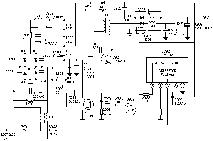 Q901截止期间,D906、D907导通,在C909、C910上建立108V和54V直流电压,同时D905导通,C908经R902、R909、T901的反馈绕组构成放电回路,同时,300V电压经R911、R907、R908向C908反向充电,使Q901的B极电压不断回升,直到Q901再次导通,便进入下一个振荡过程。