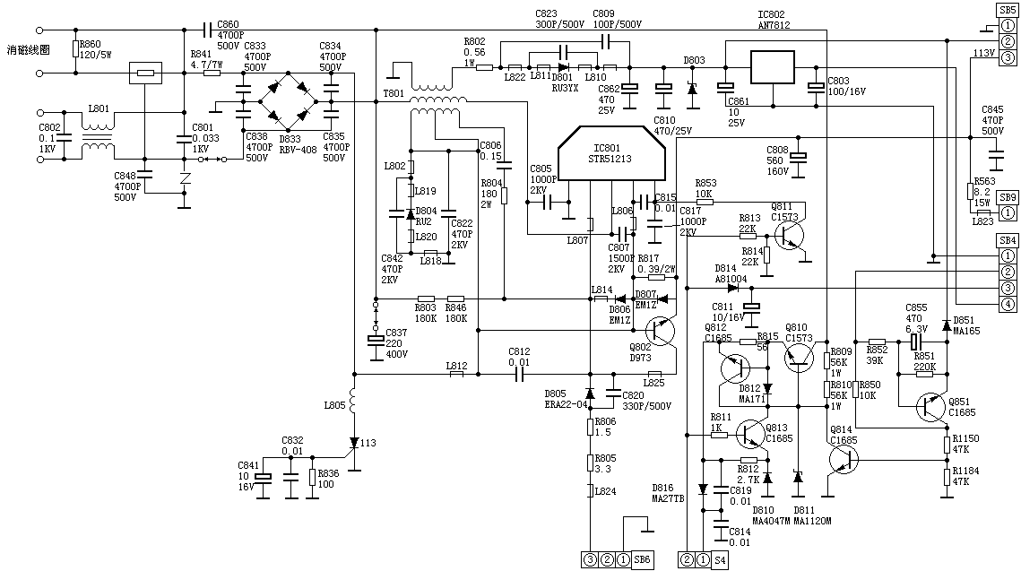 Q834为113V过压保护电路,当113V正常时,Q834截止,如113V过高,则Q834导通,113V被短路,开关电源停振。