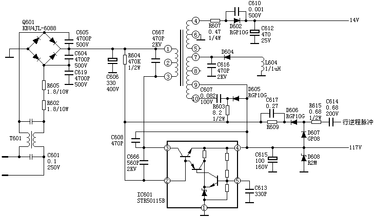 R604是起动电阻,300V电压经R603加到IC601的(2)脚内部开关管的B极上,使开关管开起导通。电流从IC601的(4)脚E极流出,在滤波电容C615上建立115V直流电压。