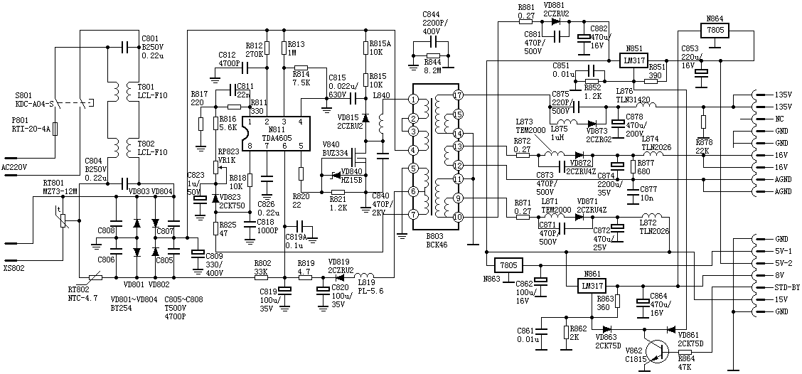N811的(1)脚为误差放大取样电流输入端,R811、R817、R816、RP823、VD823、R825、C823和开关变压器T803的(5)、(7)绕组构成稳压控制电路,当电源电压发生变化时,N811的(1)脚电压也发生变化,通过内部调节,使输出电压稳定。