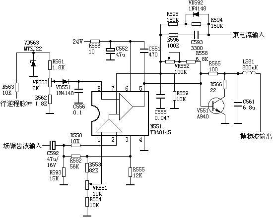 VR551是光栅梯形失真校正电位器,调节它即改变了N551的1脚的直流电位,从而改变了内部运放输出的抛物波斜率,达到校正梯形失真的作用。