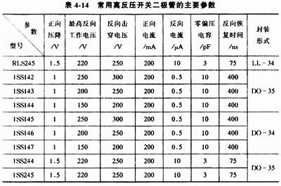 常用的高反压开关二极管有RLS系列(表面封装)和1SS系列(有引线塑封),其主要参数见表4-14。
