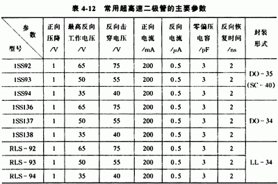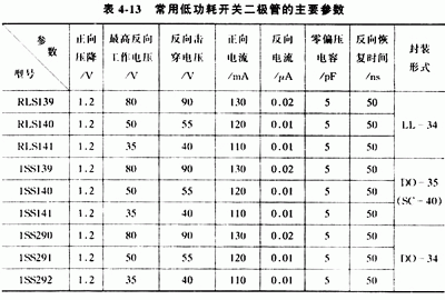 常用的低功耗开关二极管有RLS系列(表面封装)和1SS系列(有引线塑封),表4-13为其主要参数。